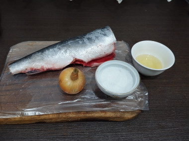 Как сделать вкусную горбуша в рассоле кусочками в домашних условиях? Подготовьте необходимые ингредиенты. Для засолки подойдёт любая горбуша. Замороженную нужно предварительно разморозить. Как это правильно сделать читайте в статье под шагами. Можно сразу купить готовое филе. Луковицу небольшого размера нарежьте кольцами или полукольцами. Масло берите рафинированное без запаха. Соль используйте только крупную засолочную, Экстра и йодированная не подойдёт.