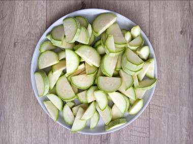 Кабачки помойте, отрежьте кончики. Разрежьте каждый кабачок вдоль пополам. Нарежьте половинки на полукольца толщиной 5-7мм. Нужно ли перед жаркой чистить кабачки? Если у вас зрелый кабачок, то срежьте с него кожуру, вырежьте семечки, а мякоть нарежьте произвольными кусочками.