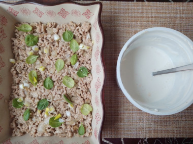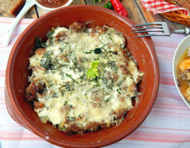 В форму выложила фарш, сверху немного зеленого лука и маленькие листики шпината, залила соусом и поставила запекаться.
