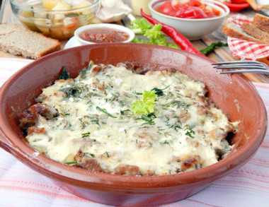 Простое, вкусное и питательное блюдо на обед или ужин! Вряд ли что-то можно придумать проще и быстрее, чем запеченный со сметаной в духовке фарш. Это простая альтернатива привычных котлет, тефтелей и других подобных блюд из фарша. Только получается вкуснее и полезнее. Однако времени, затраченного на приготовление блюда, требуется в разы меньше, не нужно формировать котлеты, достаточно фарш перемешать со специями ложкой, выложить в форму и заправить сметанным соусом. Также не нужно стоять у плиты, блюдо запекается в духовом шкафу. Фарш посыпала измельченной зеленью укропа или петрушки. Заливаем сметанным соусом. Спасибо за рецепт!