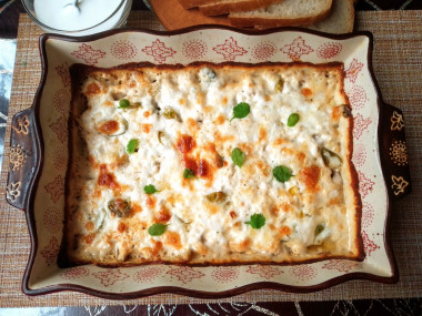 Залейте фарш подготовленной сметанной массой с сыром. Поставьте форму в духовку, предварительно разогретую до 180 градусов, на 30 минут. При запекании ориентируйтесь по своей духовке.