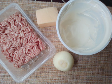 Как сделать фарш в сметанном соусе в духовке? Подготовьте для этого необходимые ингредиенты. Фарш можно использовать из любого вида мяса. Я беру фарш из свинины. Сыр выбирайте по своему вкусу. Сметану желательно брать 20 %, чтобы она не было очень жидкая.