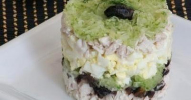 Станет настоящим украшением праздничного стола! Салат с курицей, грибами и черносливом получается очень вкусный и сытный. Если все продукты заранее подготовлены, то собрать такой салат можно за считанные минуты. Все ингредиенты отлично гармонируют между собой и не требуют больших вложений.