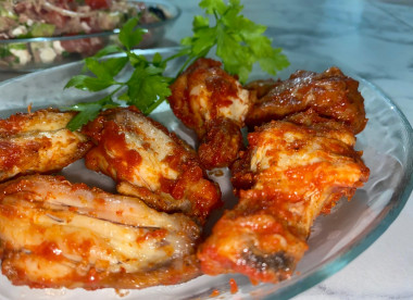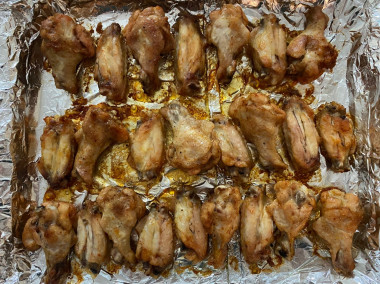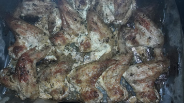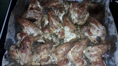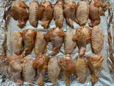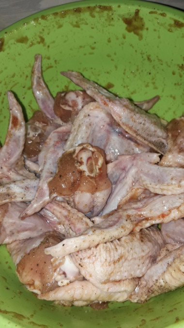Я взяла просто крылья,ничего не отрезала,сложила в тазочек,добавила все специи,которые были в наличии:соль, перец,паприка копченая, всевозможная сушёная зелень, чеснок в порошке, хмели-сунели. Перемешала и забыла на 3 часа. Выложила на пергамент и в духовку на 20 мин. В образовавшийся сок добавила майонез. Смазала крылышки ещё минут 10 запекла. Получилось невероятно вкусно.