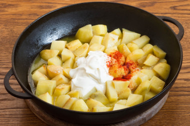 Сметану смешайте с водой и залейте картофель получившимся соусом, перемешайте. О хитростях приготовления соусов на основе сметаны читайте в статье по ссылке в конце рецепта. Если любите, чтобы было больше соуса, то воды можно добавить больше. Доведите все до кипения. По вкусу добавьте соль и немного специй. В качестве специй я беру сушеный базилик. Хорошо подойдут черный перец, сушенный укроп и чеснок.