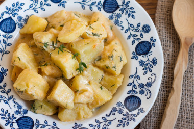Картофель, тушеный в сметане, готов! Разложите на тарелки и подавайте к столу в горячем виде. Приятного аппетита!