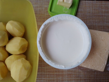 Как запечь картошку в сметане с сыром в духовке? Очень просто! Для начала подготовьте необходимые ингредиенты по списку. Сметану можете брать любой жирности. У меня 20%. Помимо указанных в рецепте специй можете использовать свои по вкусу.