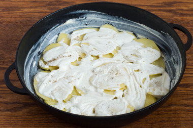 Картофель сверху посолите, поперчите и распределите половину сметаны.