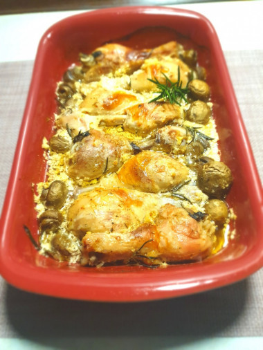 Как любая хозяйка и мама, я каждый день готовлю для своей семьи.просматривая рецепты натолкнулась на отличное блюдо,а именно куриные ножки в сметане,запечённые в духовке. Это прекрасный белковый обед,который подходит и на ужин.я взяла куриные ножки ,предварительно промытые,подсушенные и обработанные горелкой,замариновала в сметане с чесноком,добавила смесь сухих специй.у меня там были именно те которые люблю больше всего,а именно сладкая паприка,чёрный перец,кориандр,чеснок,укроп,базилик и пару веточек розмарина.который придаёт не только аромат,но и создаёт новогоднее настроение.еще решила добавить немного мимишных шампиньонов.всю эту красоту прикрыла фольгой,для того чтобы сократить время приготовления и сохранить духовку чистой.в моей газовой духовке, ножки можно сказать млели ,сначала минут 20 при температуре 200градусов,а после сняв фольгу ещё 15 минут до красивого карамельного цвета.дважды звать семью к обеду не пришлось.аромат чудесный и вкус очень порадовал.очень рада,что нашла этот рецепт,автору спасибо и браво!