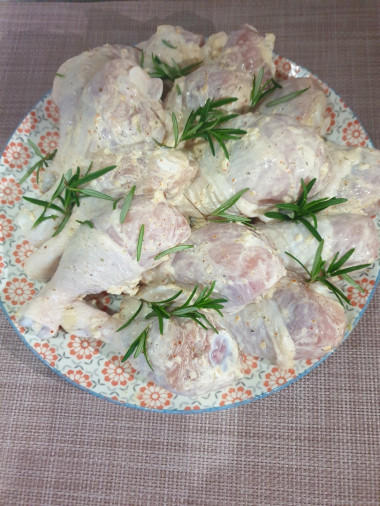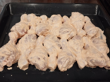 Ножки выложила в глубокую чашку. В другой чашке смешала сметану,соль,специи, измельчённый чеснок. Куриные ножки обмазала со всех сторон сметанным соусом,выложила на противень и отправила в духовой шкаф запекаться при 180° 40 минут.