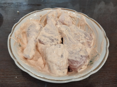 В чашу к сметане выложите куриные голени и хорошо все перемешайте, чтобы сметана равномерно их покрывала со всех сторон. Оставьте ножки мариноваться на 1 час.