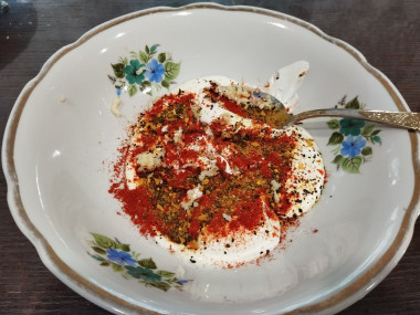 Несколько зубчиков чеснока очистите от шелухи, ополосните и пропустите через пресс. Измельченный чеснок добавьте в чашу к сметане. Все ингредиенты перемешайте между собой. По количеству чеснока ориентируйтесь на свой вкус. Для более ароматного блюда добавьте чеснока побольше.