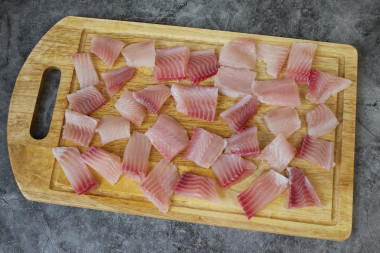 Сначала займитесь разделкой рыбы. Очистите ее, удалите внутренности, голову, хвост, плавники. Хорошо промойте и разделайте на филе. Филе порежьте порционными кусочками.