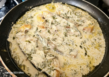 Отличный рецепт Рыба тушеная в сметане! Я правда несколько по-другому готовила, но данный рецепт взяла за основу. Вместо целой рыбы, я решила взять филе тилапии. Сначала я обжарила кусочки рыбы (у меня было 300 гр. чистого филе), затем извлекла рыбу, и обжарила на этой же сковороде целую луковицу. Потом выложила все в сковороду, сметаны добавила значительно больше (250 гр.) и тушила под закрытой крышкой 15 минут. Этого времени было более, чем достаточно. Рыбка получилось очень нежной и вкусной! Подала на стол вместе с картофельным пюре и салатом их свежих овощей. Однозначно, рецепт пошел в мою копилочку!