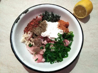 Добавьте к свинине столовую ложку с горкой сметаны и не полную ложку мёда. Выжмите сок половины свежего лимона, посолите по вкусу и посыпьте любимыми приправами. Добавьте молотые перцы, чесночный порошок, сухой базилик или орегано. Количество любой специи регулируйте на свой вкус. Если любите острые блюда, то используйте перец чили.