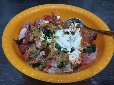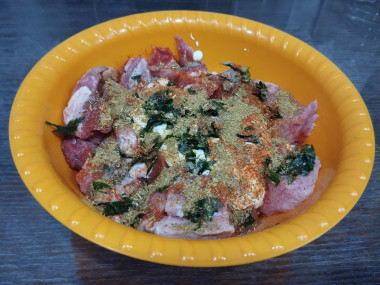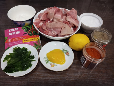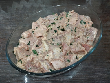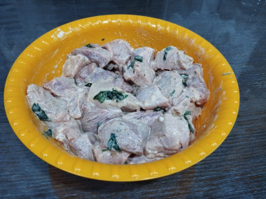 По возможности обязательно используйте хмели-сунели и щепотку молотого кориандра, эти приправы придадут особую изюминку, неповторимый вкус и красивый аппетитный оттенок готовому блюду. Снова всё хорошо перемешайте, накройте мясо пищевой плёнкой или крышкой и отправьте в холодильник мариноваться примерно на час.