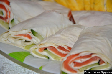Рулет из лаваша с семгой, плавленным сыром, огурцом и зеленью