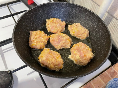 В сковороде разогрейте масло, ложкой выложите котлеты из куриного фарша. Обжарьте котлетки с двух сторон на сильном огне, уменьшите огонь, накройте крышкой и доведите котлеты до готовности.