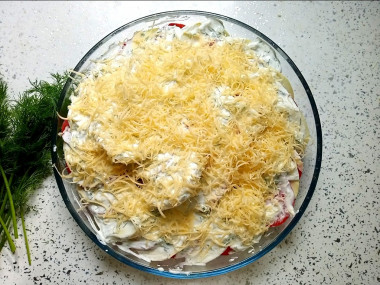 Сверху овощи смажьте ранее приготовленным соусом из сметаны с чесноком и специями.
