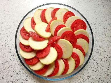 Возьмите прямоугольную или квадратную форму подходящих размеров. Смажьте ее маслом. Выложите в форму попеременно кружочки кабачков и помидоров.