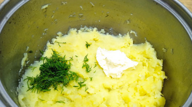 Отварите картофель до готовности на небольшом огне, на это уходит обычно 20-25 минут после закипания. Готовность проверьте ножом — он должен легко проткнуть кусочки. Слейте воду. Разомните картофель толкушкой в пюре. Добавьте сливочное масло, перемешайте. Дайте пюре немного остыть. Вбейте в него яйцо, всыпьте укроп. Добавьте соль и перец по вкусу. Перемешайте все до однородности.