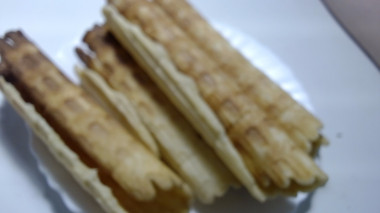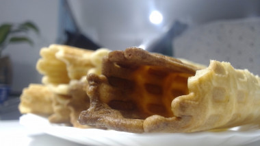 Если планируете свернуть вафли, то делайте это сразу, как только сняли их с панельки. Вафли просто моментально становятся хрупкими и ломкими. Из этого теста получится свернуть трубочки потоньше - не для начинки. Среднего размера трубочки хороши под лёгкий крем типа белкового.