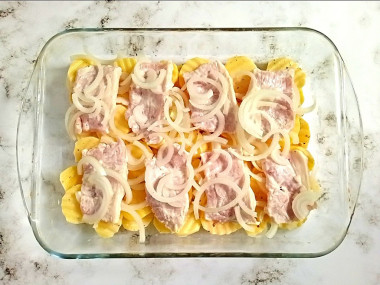 Лук очистите и нарежьте любым способом — кубиками или кольцами. Поверх мяса поместите слой нарезанного лука.