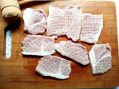 Свинину для запеканки взяла с жиром, чтобы картошка пропиталась им и стала сочной и вкусной. Отбила кусочки молоточком через пищевую пленку, чтобы не летели брызги.