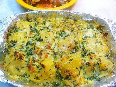 Залейте содержимое формы приготовленной заливкой так, чтобы картошка была ею покрыта. Если заливки не хватит, то сделайте еще.