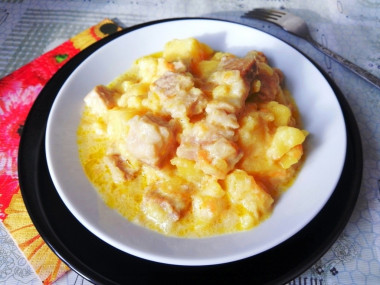 Готовила из свиной грудинки, картофеля, моркови, лука, специй. Сметану взяла 15% жирности, на вкус совсем не кислую.