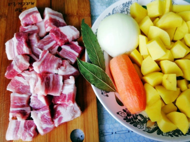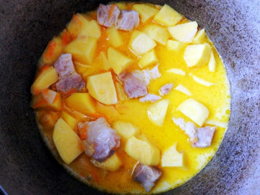 Готовила по совету автора в казане. Грудинку обжарила до золотистого цвета. Затем добавила нарезанный лук, чуть позже натертую морковь. Залила разведенной в воде сметаной. Добавила картошку, соль и специи.
