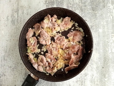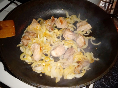 Добавьте нарезанный лук, перемешайте и продолжите жарить минутку с луком.