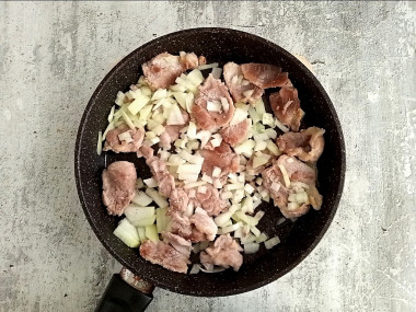 Кусочки мяса переверните, жарьте до румяной корочки с другой стороны. В течение 5-6 минут при постоянном помешивании обжарьте свинину со всех сторон.