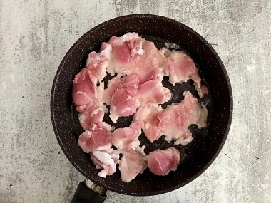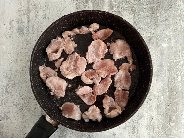 Разогрейте сковороду с небольшим количеством подсолнечного масла. выложите кусочки свинины и быстро обжарьте. Если свинина слишком жирная, то просто сначала положите кусочки пожирнее и вытопите жир, на котором и будете жарить мясо.