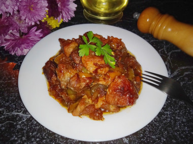 Свинина томилась с луком, благодаря чему пропиталась его соком. Мясо стало мягким и сочным! При этом оно не тушеное, а именно жареное. Очень вкусно!