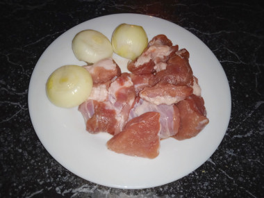 Снимите у свинины шкурку, если таковая имеется на вашем куске мяса. Свинину порежьте небольшими кусочками.