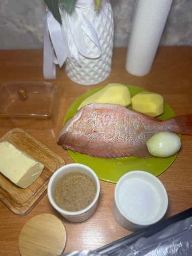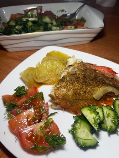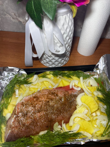 Морской окунь, запеченный с картофелем готов. Приятного аппетита!