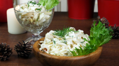 Салат с кальмарами, яблоком и яйцом получается такой нежный, такой сочный. Я просто влюбилась в этот салатик!! Шикарно! И для будничного ужина подойдёт, и для праздников. Спасибо автору за рецепт!