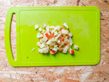 Яблоко тщательно вымойте, обсушите. По желанию можете очистить от кожуры, удалите сердцевину с семенами и нарежьте небольшими кубиками. Если яблоко начнет быстро темнеть, сбрызните его лимонным соком.