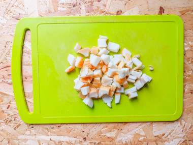Яйца вымойте под проточной водой, отварите вкрутую, охладите и очистите от скорлупы. Нарежьте мелкими кубиками. Чем ярче будут желтки, тем красивее получится салат. О том, как правильно варить яйца, читайте в отдельной статье в конце рецепта под шагами.