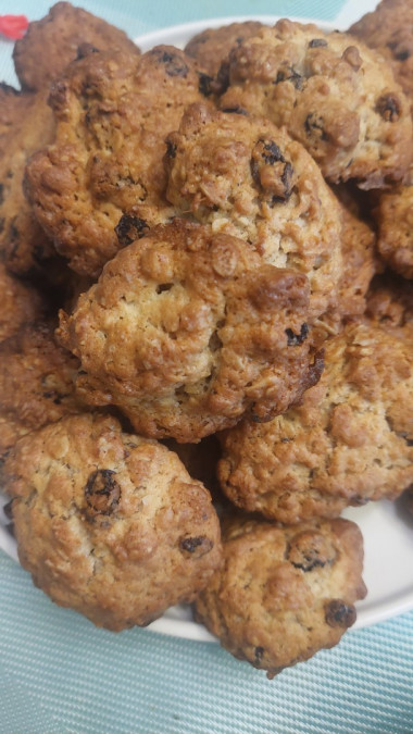 Мне не очень нравится изюм в выпечке, предпочитаю овсяное печенье с орехами. Посмотрите рецепт.