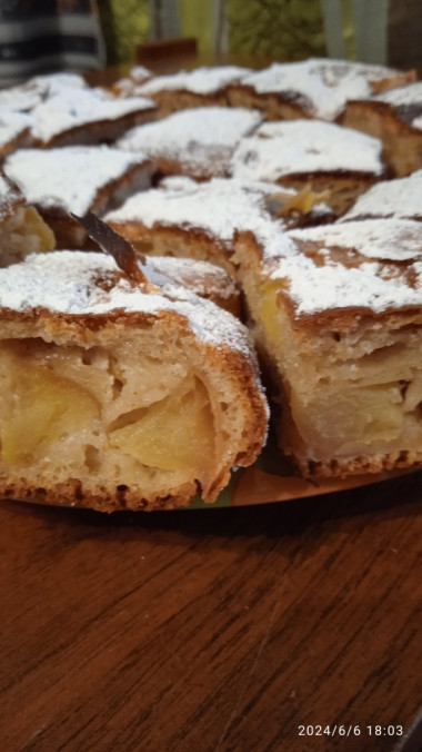 Невероятно вкусная шарлотка.. Я в восторге. Пышная, сочная. Немного изменила количество яиц (2), сметаны было 150 г.добавила кефир 100 мл.