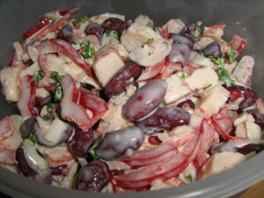 Смотри видеоСалат с крабовыми палочками сухариками и фасолью