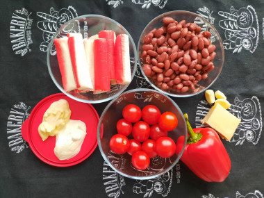 Калорийность продуктов: Крабовые палочки, Фасоль консервированная, Помидоры черри, Твёрдый сыр, Болгарский перец, Чеснок, Майонез, Сметана, Перец черный молотый, Соль