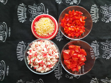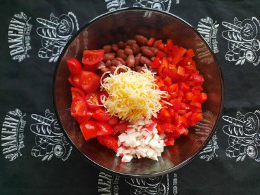 Как сделать салат с фасолью и крабовыми палочками? Отмерьте все необходимые ингредиенты. Вам понадобится красная консервированная фасоль в собственном соку, крупный болгарский перец желтого цвета, крабовые палочки, помидоры черри (около 5-6 шт), вкусный твердый сыр и специи.