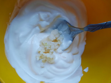 В небольшой емкости соедините в равных пропорциях сметану любой жирности, майонез, пропущенный через пресс чеснок, соль, молотый черный перец. Перемешайте. Количество чеснока регулируйте по своему вкусу.