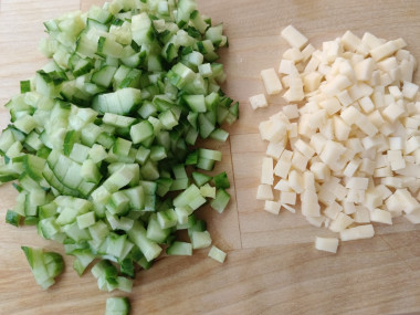 Свежие огурцы помойте, обсушите. Нарежьте тоже маленькими кубиками. Добавьте к ранее подготовленным продуктам.