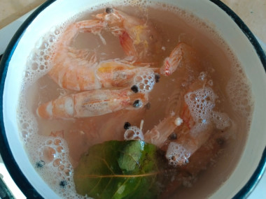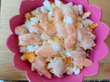 Замороженные креветки достаньте из упаковки и поместите на 1-2 минуты в кипящую подсоленную воду. Откиньте на дуршлаг. Не надо варить креветки дольше — они станут резиновыми. Остывшие креветки очистите - оторвите хвостики, голову и снимите панцирь. Если креветки крупные, то можете разрезать их пополам. Выложите в посуду с салатом.