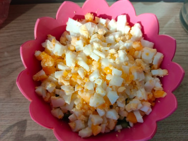 Яйца отварите вкрутую. Как сварить яйца вкрутую? Чтобы яйца при варке не треснули, положите их в холодную воду и поставьте варить на небольшой огонь. Варите яйца 9 минут после закипания, затем залейте холодной водой и остудите. От резкого перепада температур скорлупа лучше очистится. Охлажденные яйца очистите от скорлупы и нарежьте маленькими кубиками. Выложите подготовленные яйца в глубокую посуду.