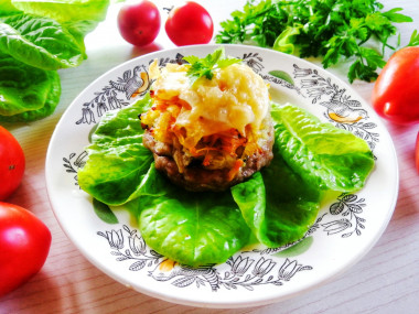 Стожки получились мягкие и сочные. В этом помогли натертая на мелкой терке картошка, майонез (заменила им сметану) и обжаренные овощи (лук с морковкой). Последние подарили ещё и особенный вкус. Вообще, зажарка очень подошла ко всем ингредиентам блюда и очень его украсила. Так, во всяком случае, мне кажется, поскольку я очень люблю жареные морковь и лук.